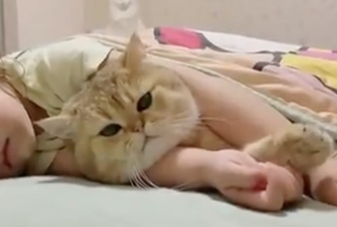 ぐっすり眠っている子ども。 その腕の中には、まん丸顔の猫さんが。 ぎゅーっとハグするように両腕に挟まれ、 ぼーっとしている猫さん。 「動けにゃい...」と悩んでいるのかな? それでもしばらくすると、 猫さんもウトウトしてきて...。 ほのぼのする家族... -