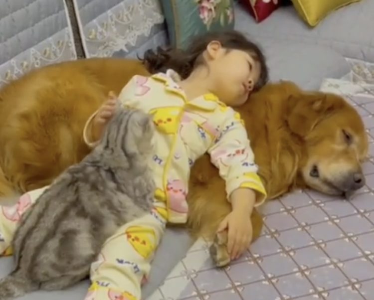 これいいなぁ♪ 猫と犬に挟まれてサンドイッチ状態!