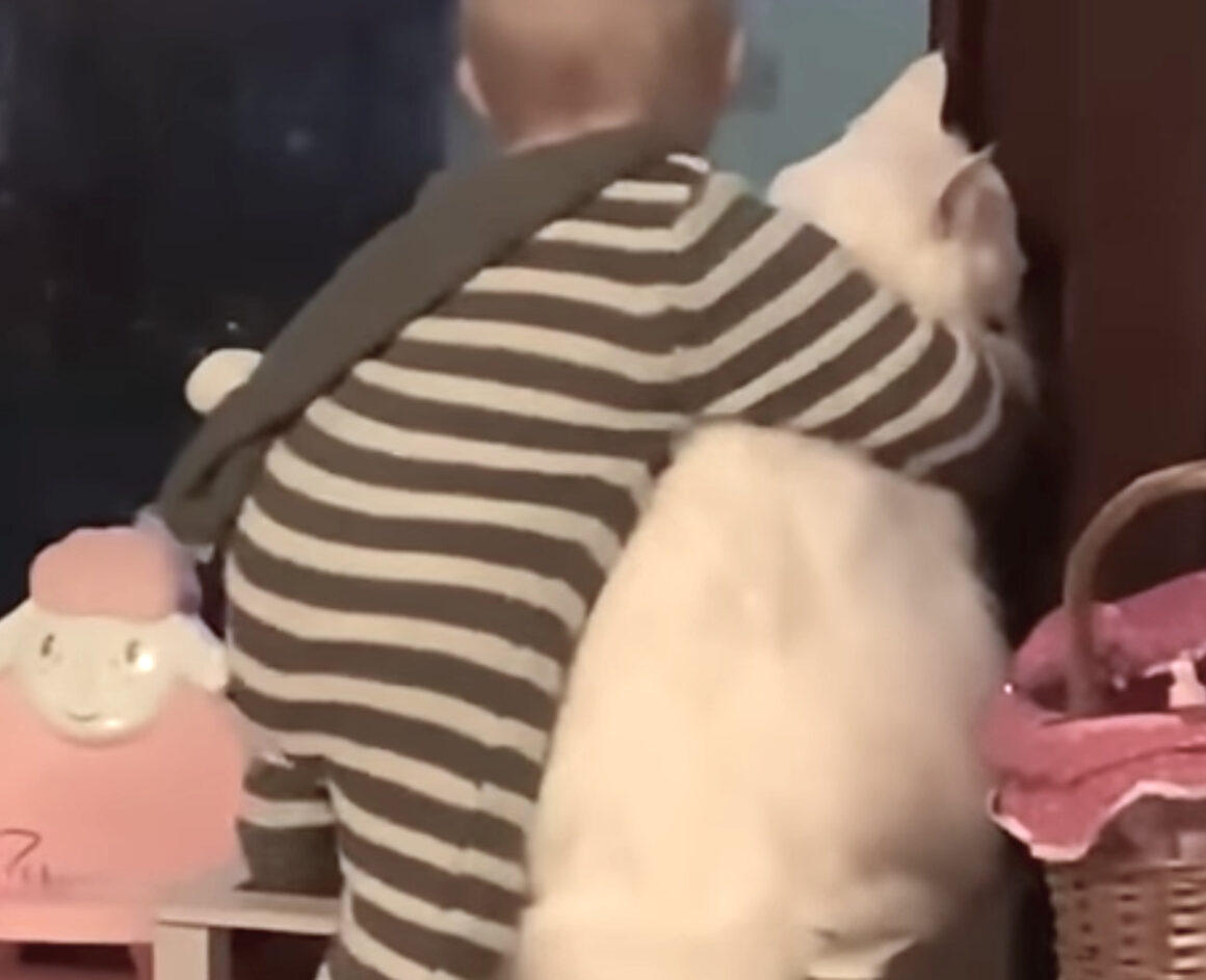 愛猫が大好きでたまらない赤ちゃん、いつでもどこでも一緒♪