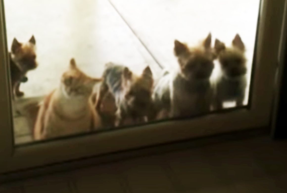 ガラス扉の向こう側で、 お部屋の中を覗いている子犬さんたち。 中に入りたいけれど...扉が閉まっているので 入れずに困っている様子です。 よく見ると、そんな子犬たちに混じって 大きな猫さんが1匹いるぞ! 同じく部屋に入りたいようで、 隣にいた子犬... -