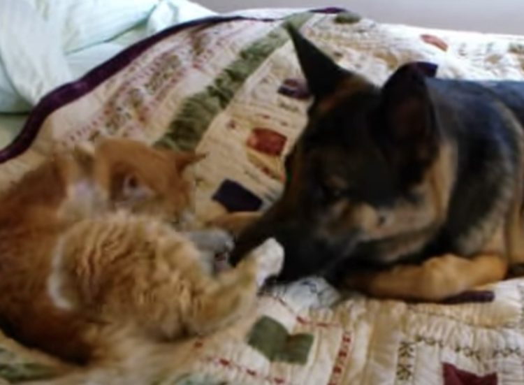 積極的な子猫さんと、オロオロする大型犬。