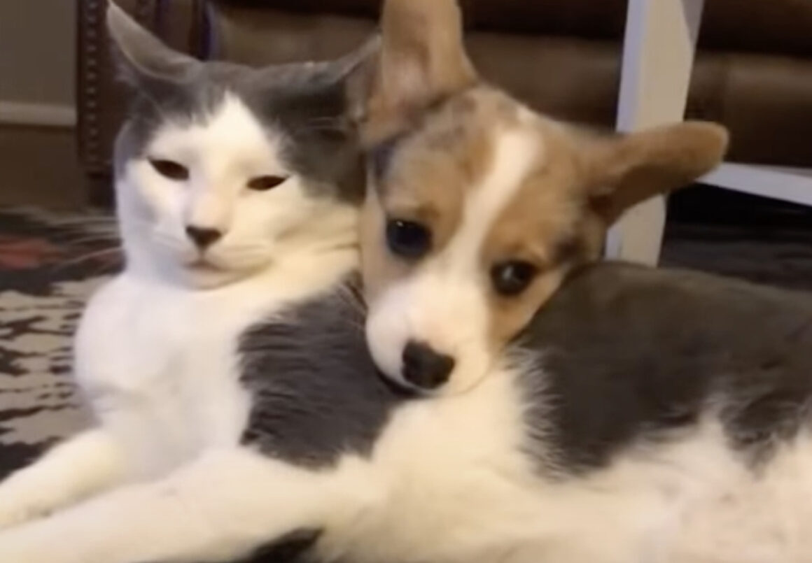 アゴを置かれて重い、けど嫌じゃニャいよ。仲良し猫と子犬。