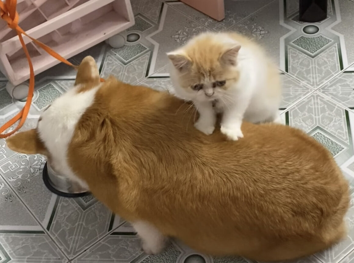 ゴハンを食べているコーギー犬の側で 両手を犬さんに乗せている子猫。 どうやら犬さんの腰をモミモミと マッサージしているようで、 子猫「揉んであげるから!ゴハン分けてよ!」と 何か見返りを求めているようにも見えますが 犬さんは反応もせずゴハンに... -