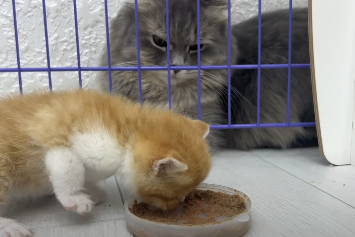 ずる賢い猫さん、子猫のごはんを味見したいにゃ!
