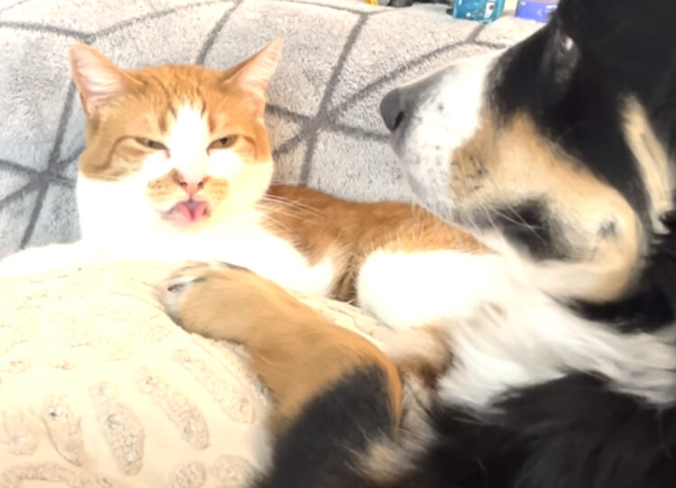 猫「赤ちゃんの時の癖が抜けにゃいの」同居犬に見守られながらエアチュパチュパ♪