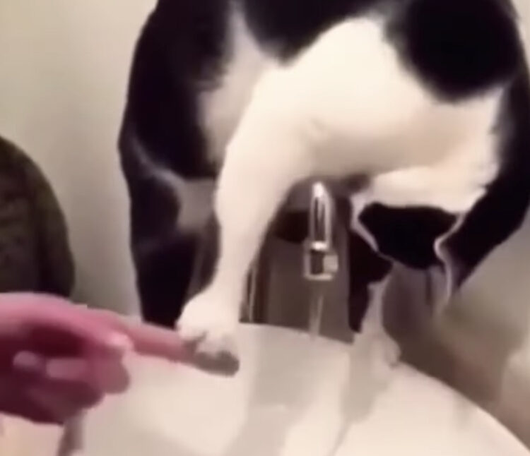 洗面台に立っている白黒猫ちゃん。 蛇口から流れ出ているお水を 飲みたがっているようですが... このままだと飲み辛いし、 お顔が濡れちゃうというのを知っているみたい。 そこで! とっても賢い猫ちゃんは、 とある作戦を考えたのです。 近くにいた飼い主... -