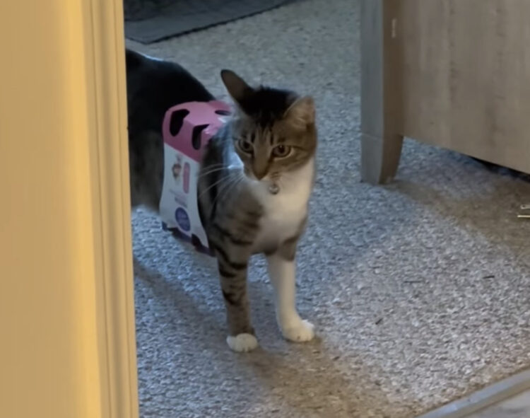 スチャッ! 腰回りにぴったり! 箱を装着して遊ぶ猫さん。