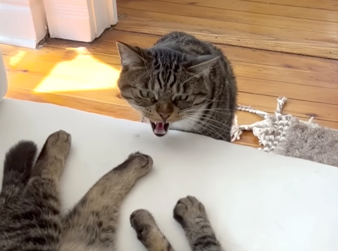 先住猫が威嚇しているのに、気にせず爆睡する保護猫ちゃん♪