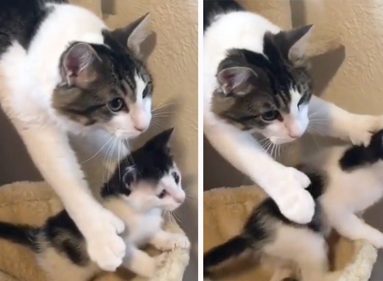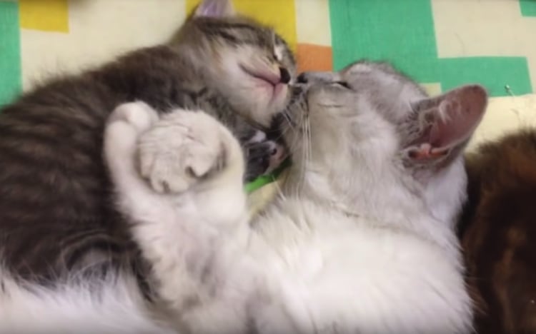 子猫にチュッ。愛情たっぷりの母猫の子守に癒される…