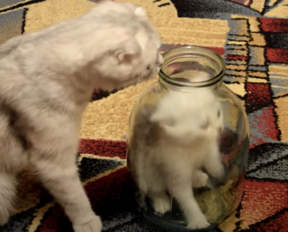 え? 出られるよね? ビンに入った子猫を心配する母猫。