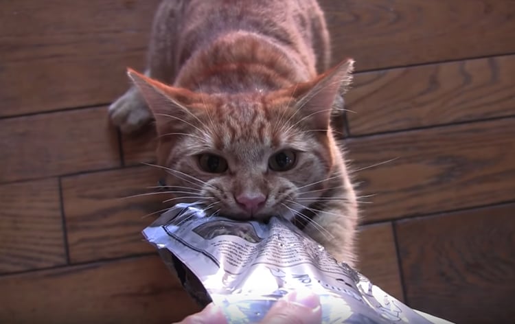 ホラーレベル?!キャットフードの袋に喰らいついて離さない猫。