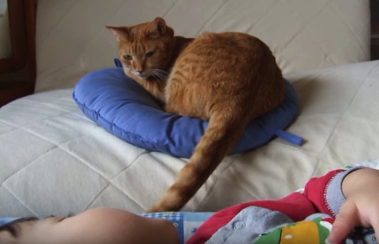 しっぽフリフリ〜。子猫と同じように赤ちゃんをあやす猫。