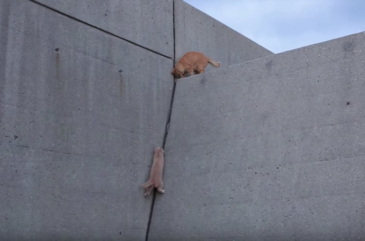 ハラハラしちゃう!高いコンクリートの壁を登る子猫。