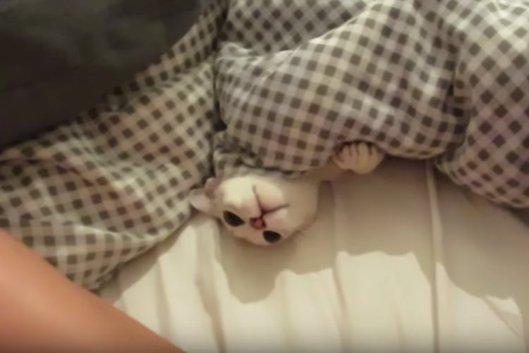 寒い冬にぴったり?お布団に隠れて猫パンチする子猫。