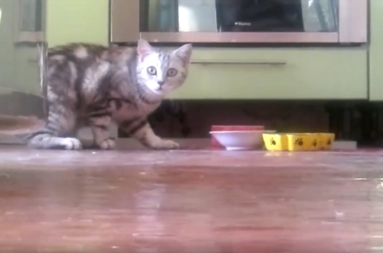 ごはんを食べようとやってきた猫さん 撮影されていることに気づくと、ハッ…!! とびっくり顔 そのままズズズ…っとランチョンマットをひっぱって カメラからは見えないところで隠れて食べ始めました。 食事中は撮影NG? 恥ずかしがり屋な猫さんなのでし... -