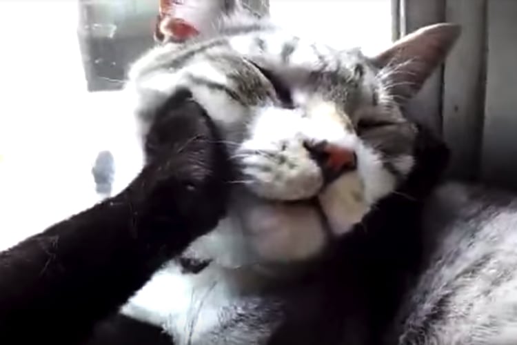 愛が重すぎる…!黒猫の顔面フミフミに耐える猫。