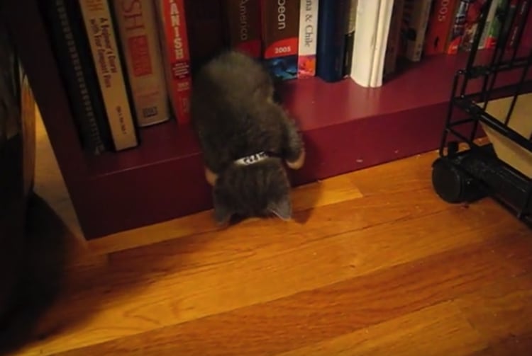 ほんもの?ぬいぐるみ?本棚で寝落ちする子猫。