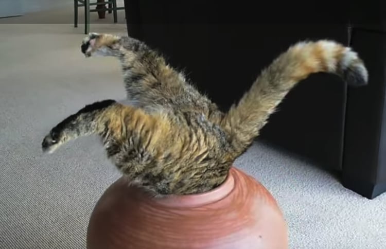この壺いいにゃ〜と入り出す猫さん。 だけど、あれ? ちょっとお肉が邪魔をして… 壺にハマってしまい、大開脚でフリーズ! シンクロナイズドスイミングみたい? ぽっちゃり可愛い猫さんなのでした。 [youtube https://www.youtube.com/watch?v=EHwu-H_Ktf... -