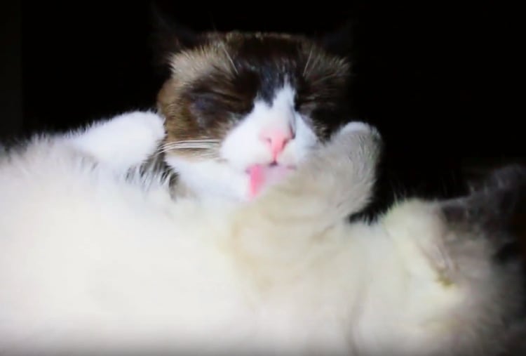 棚の上で子猫の毛づくろいをしていた猫。ちょっとやりすぎてしまい…?