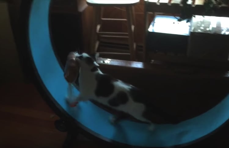 平常運行?パンを盗んだ猫、回し車で回ってごまかす。