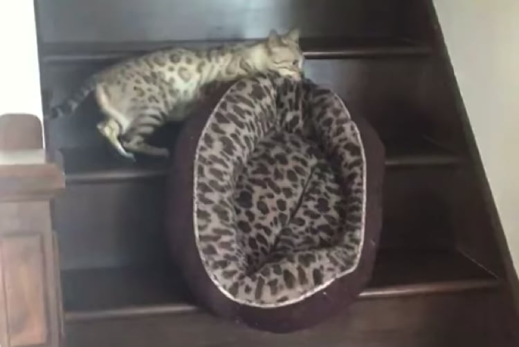 二階で寝るんだもん!一生懸命ベッドを運ぶ猫。
