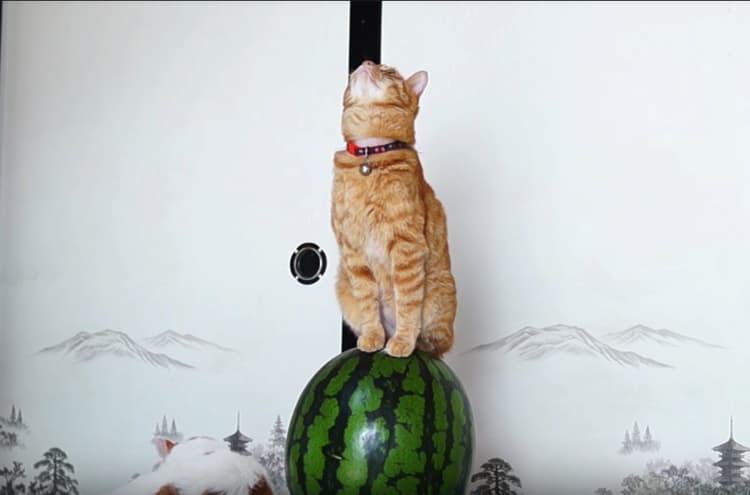 スイカの玉乗り?!バランス感覚のすごいねこ。