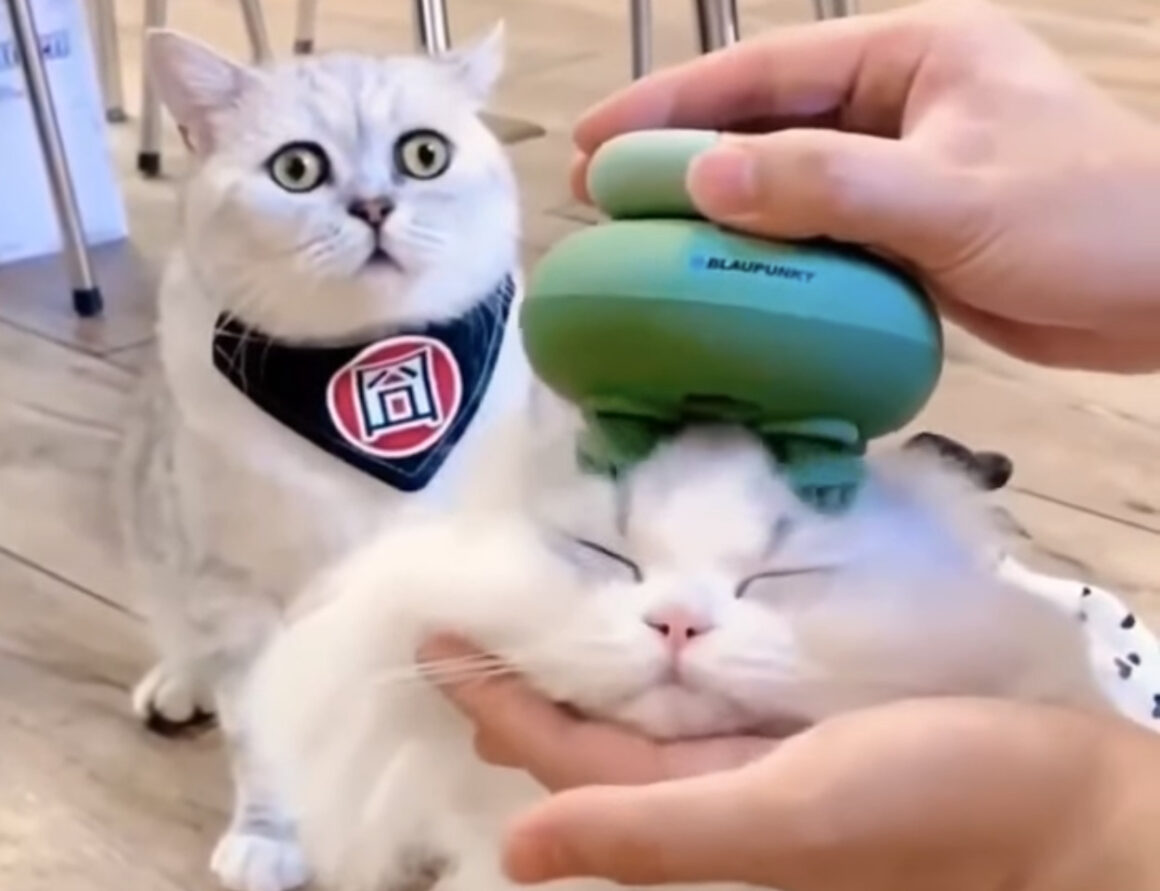 ぐりぐり動くヘッドマッサージの機械で 頭をモミモミしてもらっている猫さん。 結構気持ち良いのか目を閉じて、 飼い主さんの手にもたれかかりながら うっと〜りしています。 そんな様子を、目を丸くしながら とってもびっくりした顔で見ているのが 後ろに... -