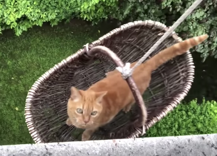 怖くないにゃ!バスケットをエレベーターにする猫さん。