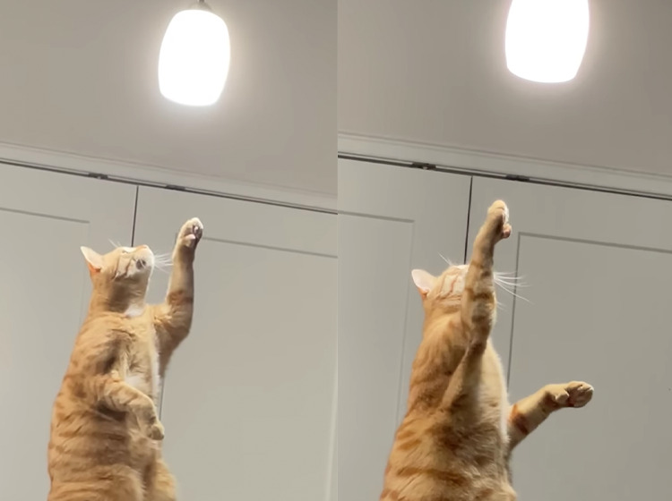 キッチンのカウンターでしょうか 猫さんがそこに登って 一生懸命ライトに向かって手を延ばしています。 眩しいだろうけど... じっとライトの方を見つめて 二本足で立ち上がり、届かないかなぁと 夢中になって手を延ばしています。 どうしてそれを触りたい...