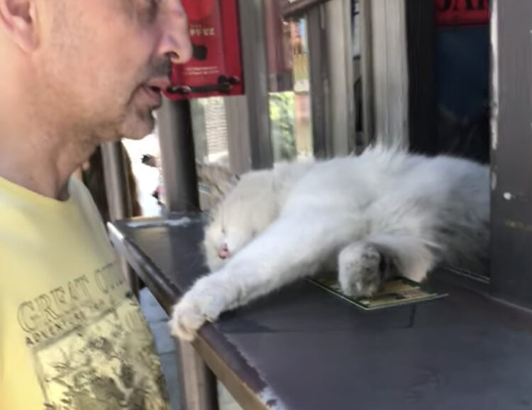 お昼時間なの? お客さんが来ても爆睡する猫。