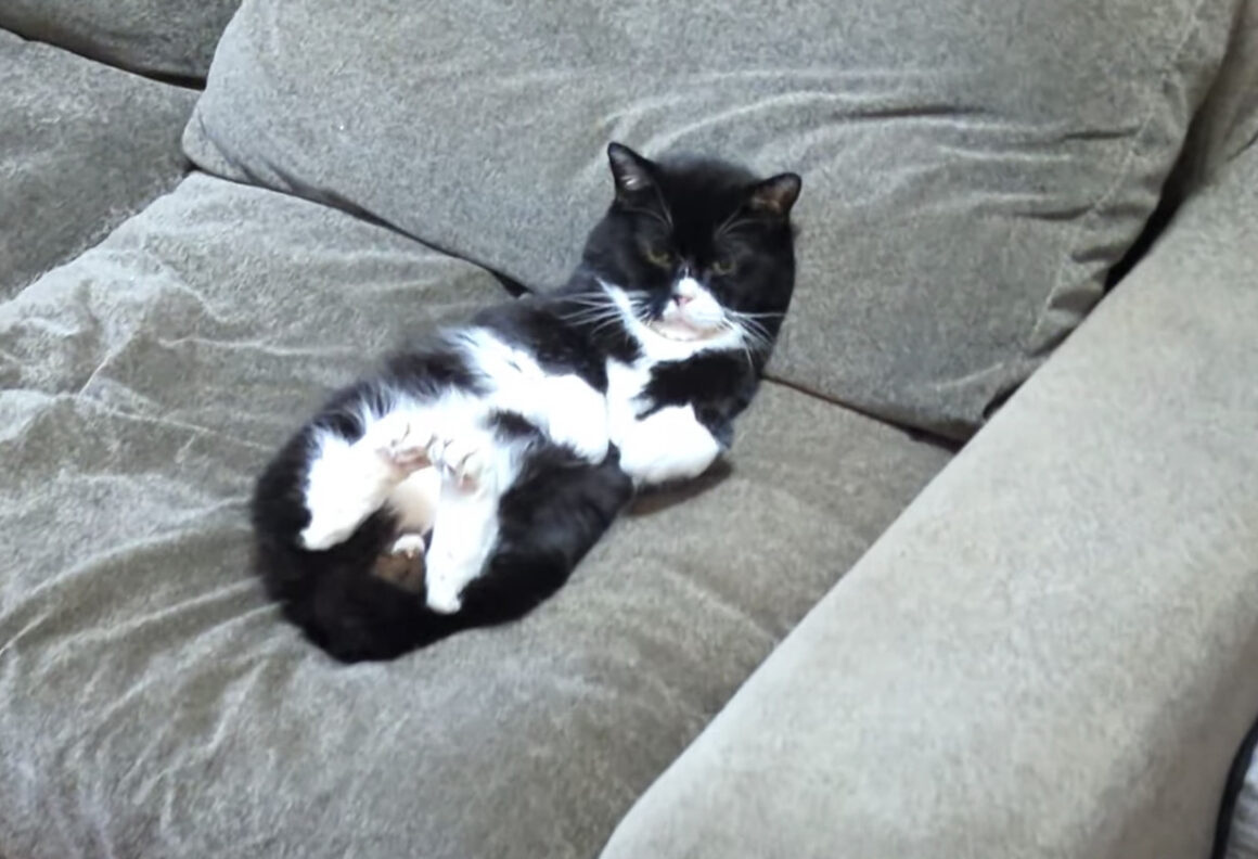 ソファでくつろぐ姿が、まるで人間みたいな猫さん。