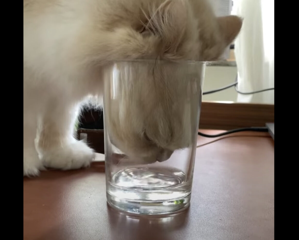 ムニュ〜!!顔を押し込んでグラスから水を飲みたい猫さん。