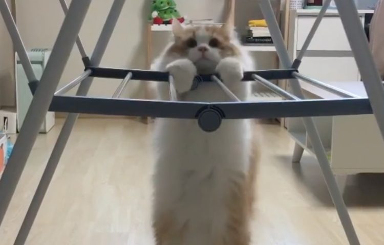 「ふんっ!ふんっ!」鍛えてるのかな?懸垂している猫さん。