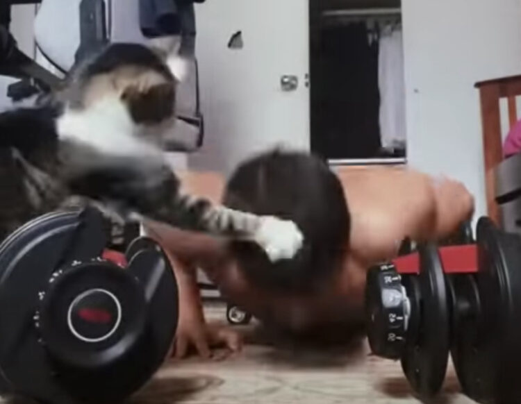 筋肉ムキムキの男性がトレーニング中。 お部屋でひとりでトレーニングするのは モチベーションを保つのもなかなか大変。 さらにこの男性の場合は、 もっと大変な理由がもう一つありました。 それは飼っている猫さんが 筋トレをしている最中に邪魔をしてく... -