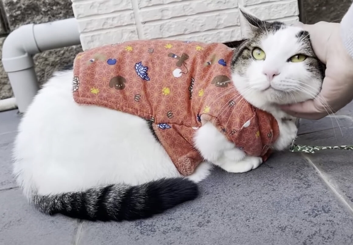 これでポカポカだにゃ〜♪ ちゃんちゃんこを着てお散歩する猫。