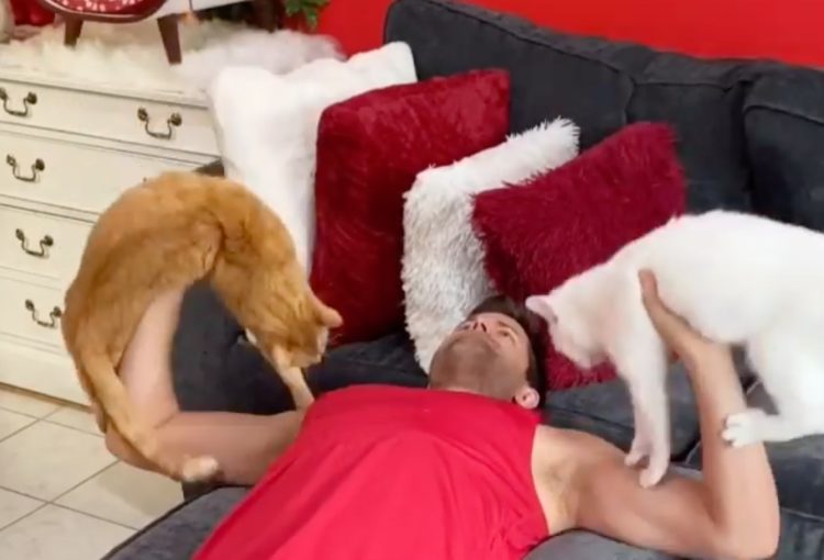 真っ赤なタンプトップを着て ムキムキで元気そうな男性。 最近コロナの影響で、 ジムが休館になっていたり 営業時間が短くなったりと、 ずっと通っていた人からすると困った状況に。 そんな時だって、自宅で楽しく 愛猫と一緒にトレーニングできるよ!と ... -
