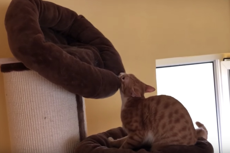 もっと高い場所で眠りたい!自分でベッドを作る猫。