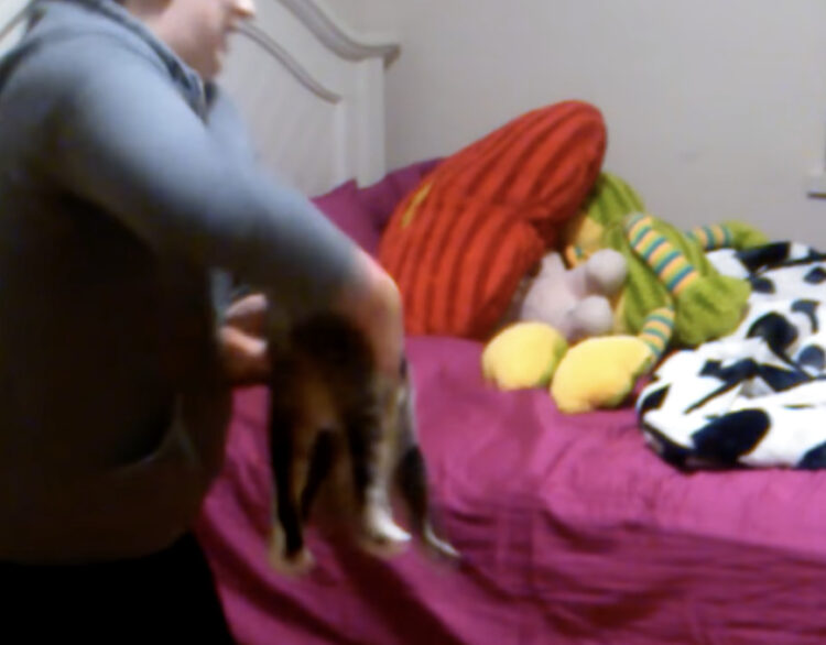 「ここで寝るの!」何度降ろされてもベッドに戻って来ちゃう猫。