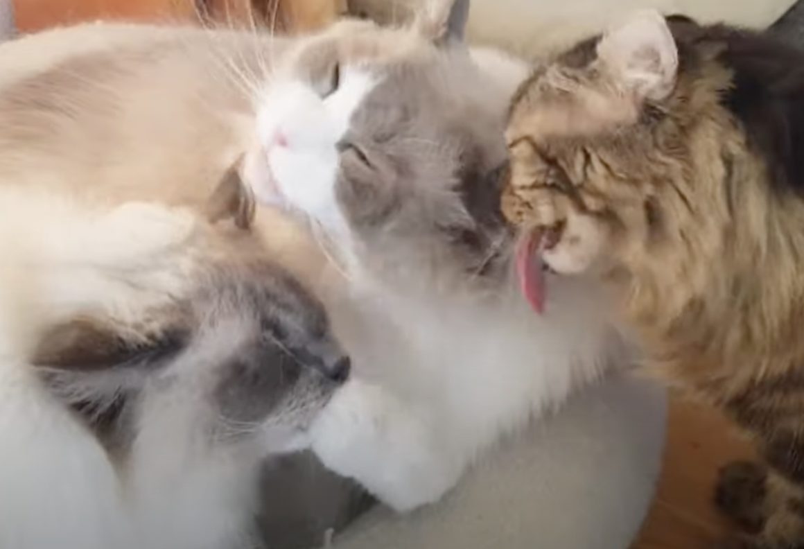 これで3匹同時に毛繕い♪ 仲良し猫トリオ。