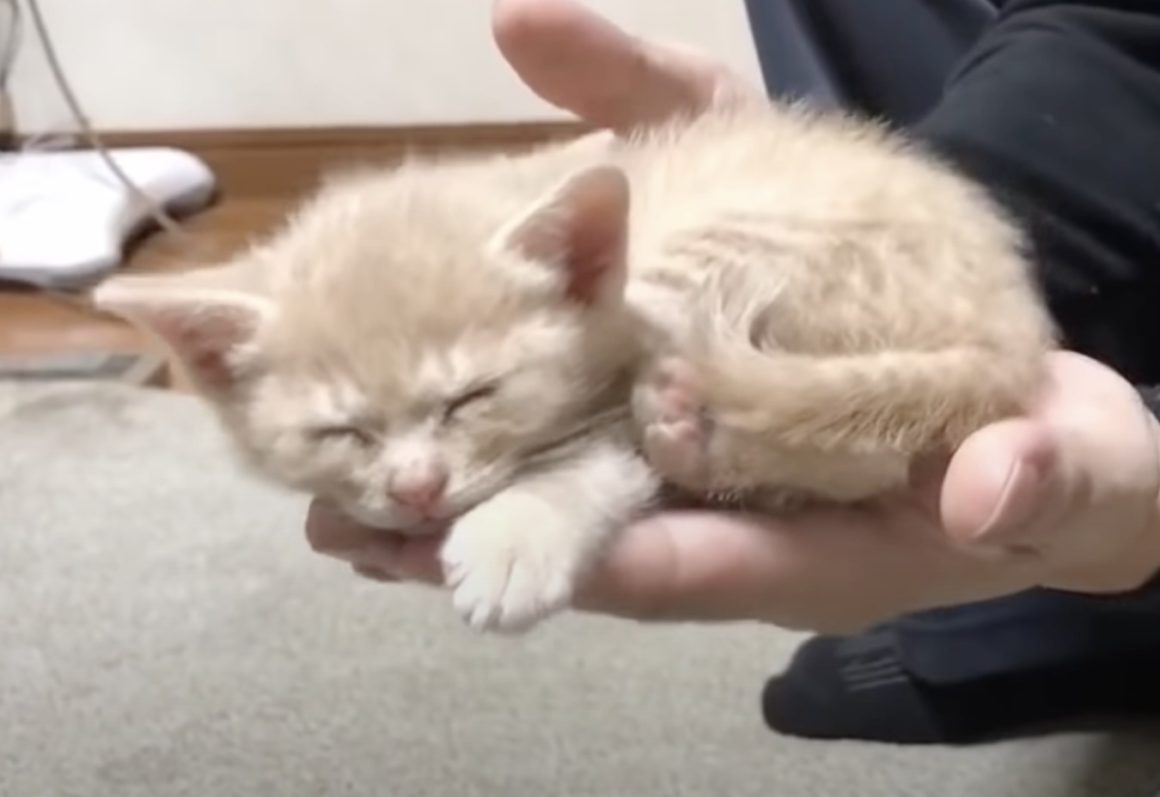 手のひらにすっぽり収まる子猫、そのまま眠る姿が可愛い♪
