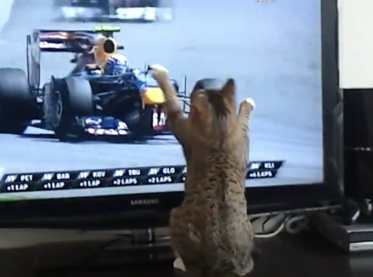動くものを見つけたら、 飛び掛からずにはいられない習性の猫さん。 それはテレビに映っているものも同じ! 飼い主さんがF1のレースを鑑賞していると テレビの前に陣取ってしまう猫さん。 ビュンビュン走っていくレーシングマシンが 気になって仕方がない... -