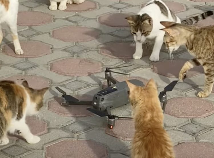 見慣れないやつだにゃ…ドローンを囲む猫集団。