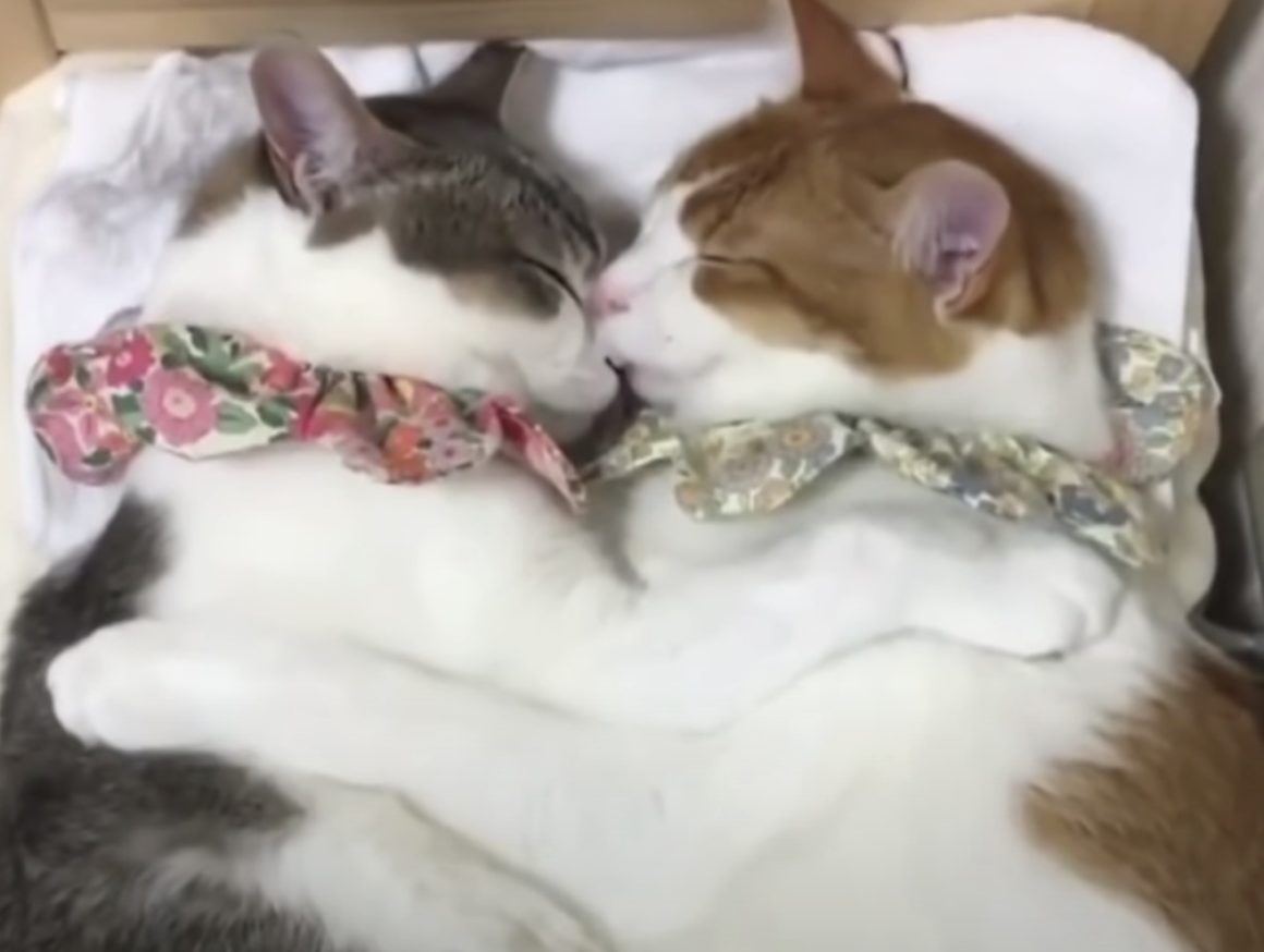 寝顔も可愛い〜!小さなベッドで抱き合って眠る猫。