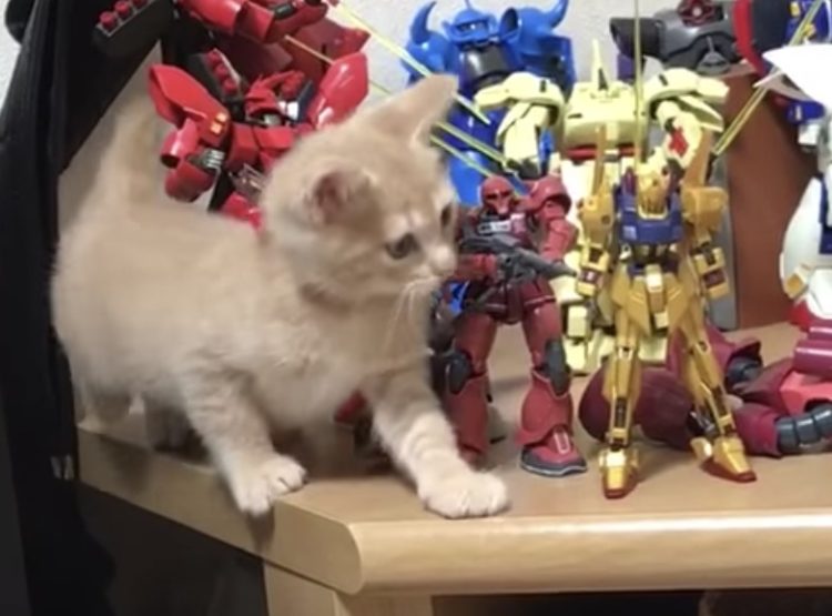 プラモデルを倒さずに進めるかにゃ?ハラハラする子猫の挑戦。