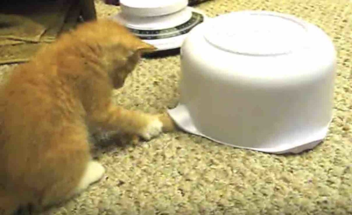 白いタライがひっくり返って置かれているぞ。 飼い主さんが指でチョイチョイとつっつくと、 中からニョキッと可愛い手が! 子猫もやってきて、タライの中に興味津々。 パシパシと叩いて遊んでます。 この遊びはタライの中の正体が現れるまで続き... なんと... -