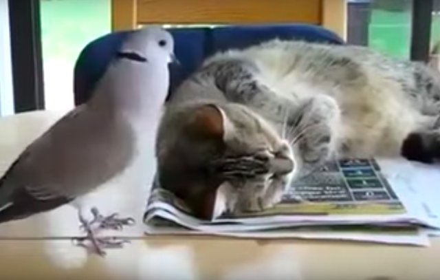 お昼寝の邪魔だにゃ!! ねこさんにイタズラしたいハト