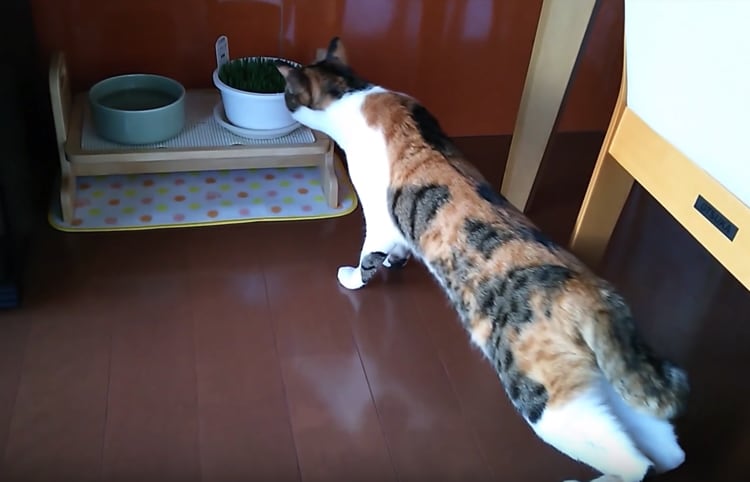 そんなに?!初めての猫草にへっぴり腰になっちゃう猫。