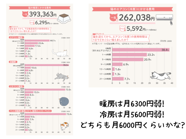 猫が来てからどのくらい冷暖房費が増えたのかを調査しています。暖房のほうが高いのは意外な気もしますね。月あたりは5千円から6千円ほど増えています。地域差が大きそうです。