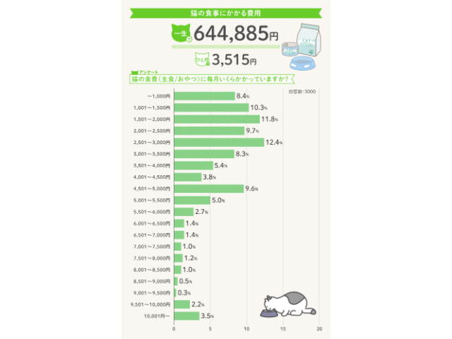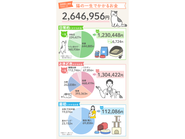 引用元: R&Cマガジン「猫の一生にかかるお金はいくら?食費や医療費など生涯の飼育費用を3000人調査」