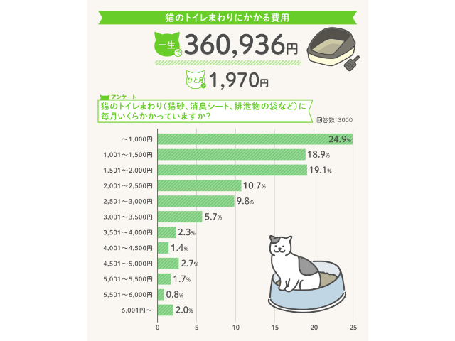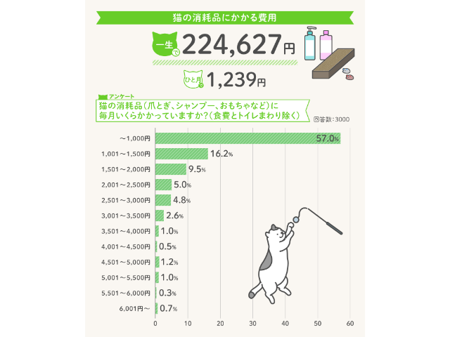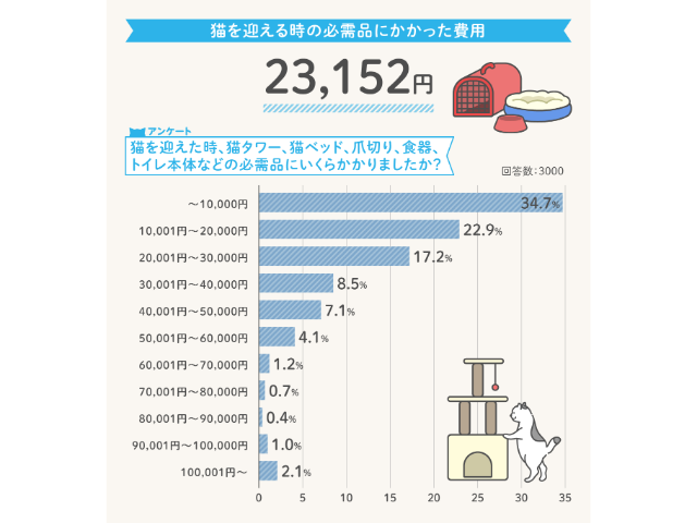 需品とは猫タワー、猫ベッド、爪切り、食器、トイレ本体など)で、2万3千円程度。人によっては10万円を超える場合もある一方で、3人に1人は1万円以下です。